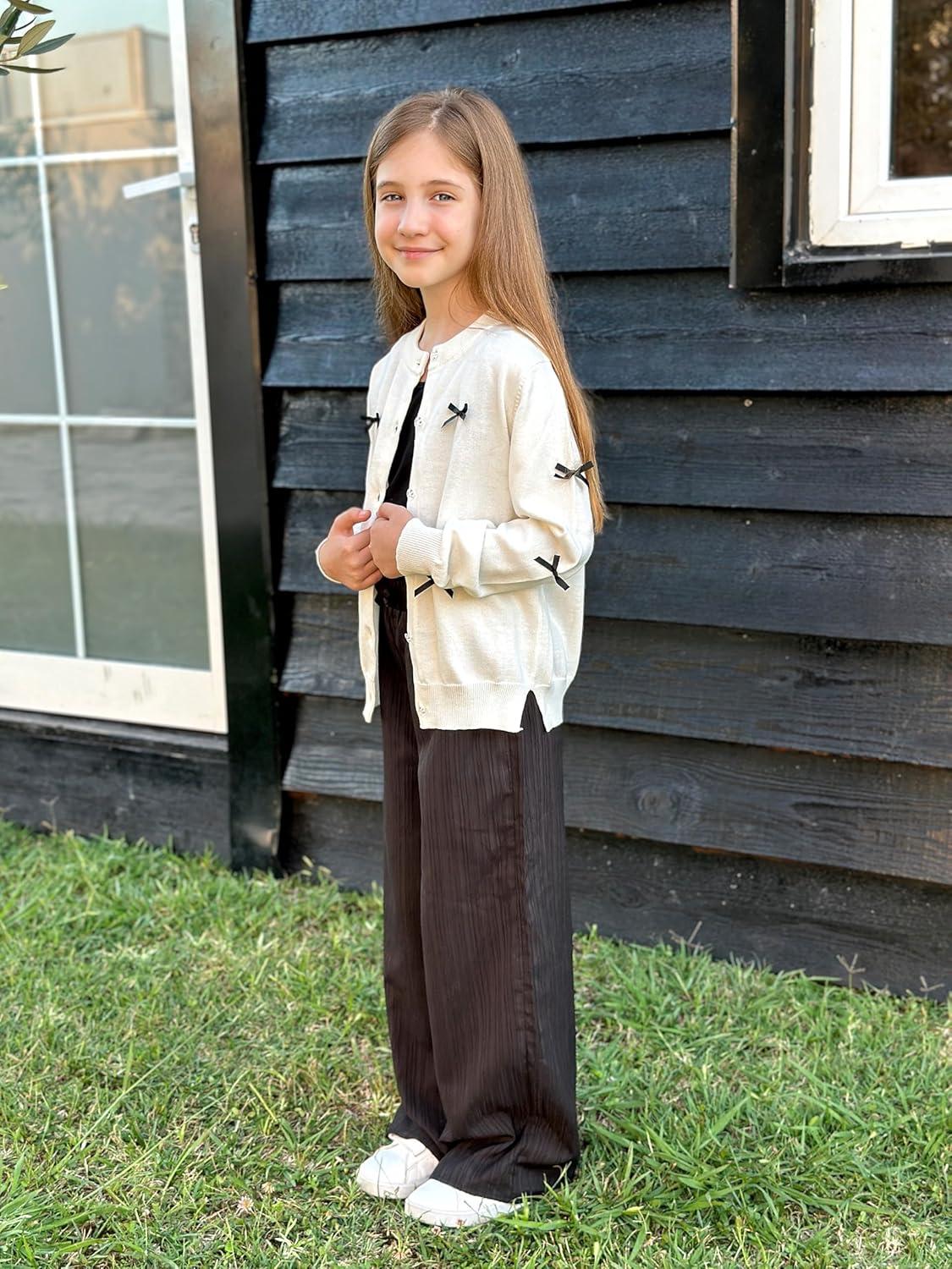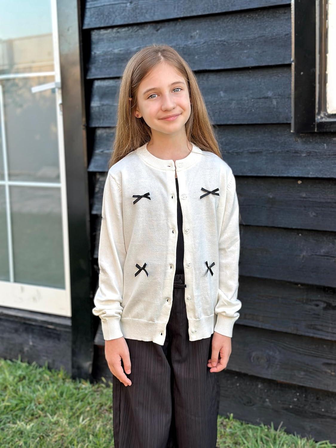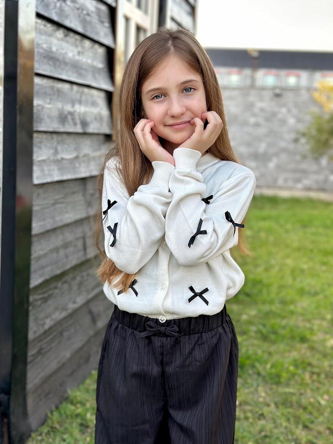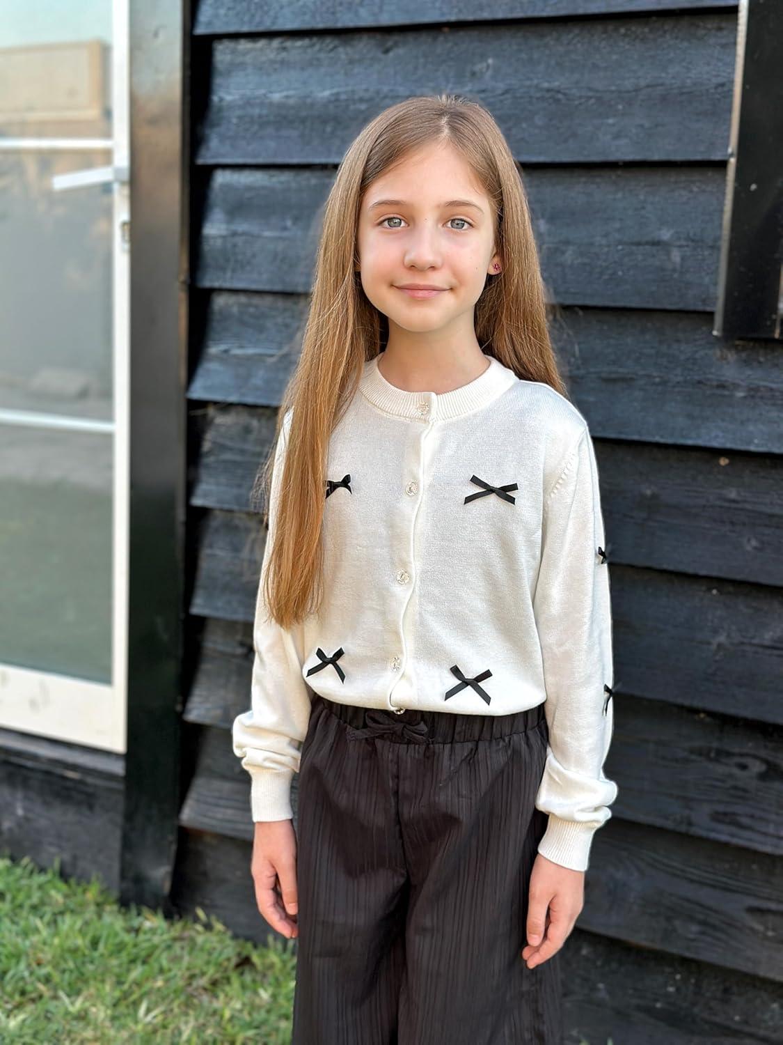 Rolanko Girls Cardigan Sparkling Sequin Kids Knit Button Up Sweater Cardigan Long Sleeve 4-11 Years(Bowwhite)