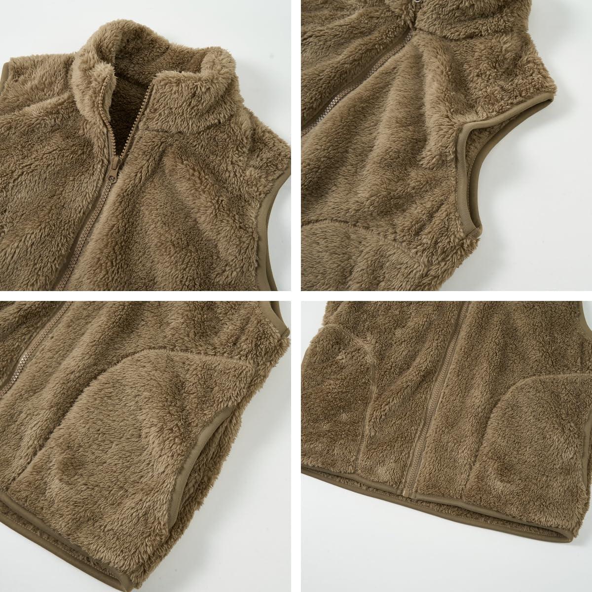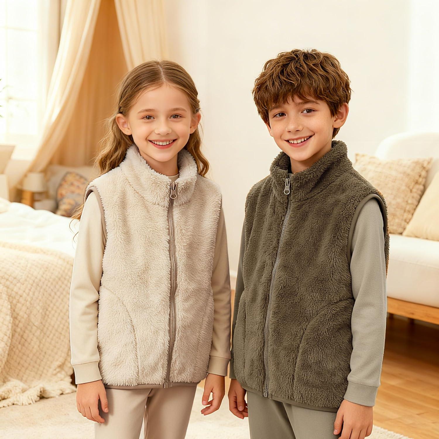 Keep Them Warm in Cozy Style with Rolanko Kids Sherpa Fleece Vest – made from 100% polyester sherpa fleece, this lightweight yet fluffy vest offers the perfect balance of warmth and comfort. The fuzzy teddy texture is soft, skin-friendly, and breathable, giving kids all-day coziness without itching or shedding. Designed for everyday wear, it features a stand collar to block chilly breezes, a smooth full-zip closure for easy on and off, and neatly bound armholes and hem for durability. Two handy side pockets warm little hands or carry small treasures, while the sleeveless cut keeps her core warm but arms free to move. It layers effortlessly over tees and sweaters in fall or spring, or under coats in winter for extra insulation without bulk. Practical and versatile, this kids vest pairs easily with jeans, leggings, or skirts for school, playdates, or family outings. Machine washable and durable, it holds shape and softness wash after wash. A cozy outerwear staple for girls and boys, and a thoughtful holiday or birthday gift choice.