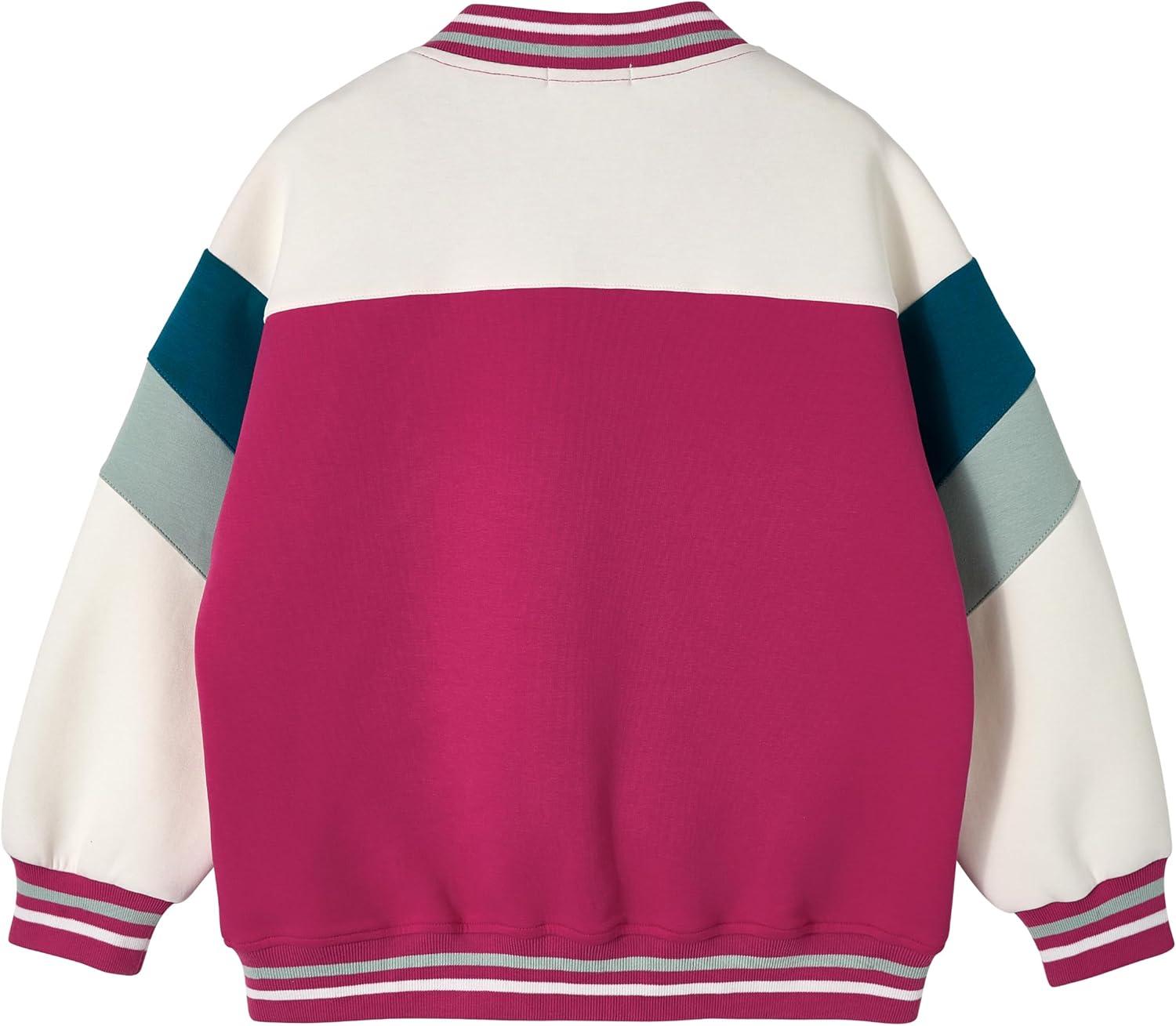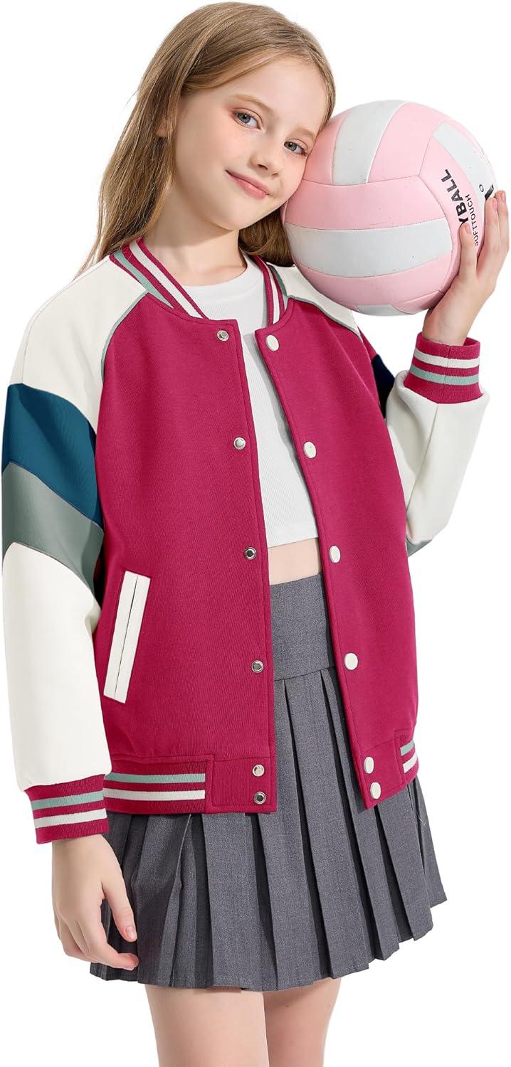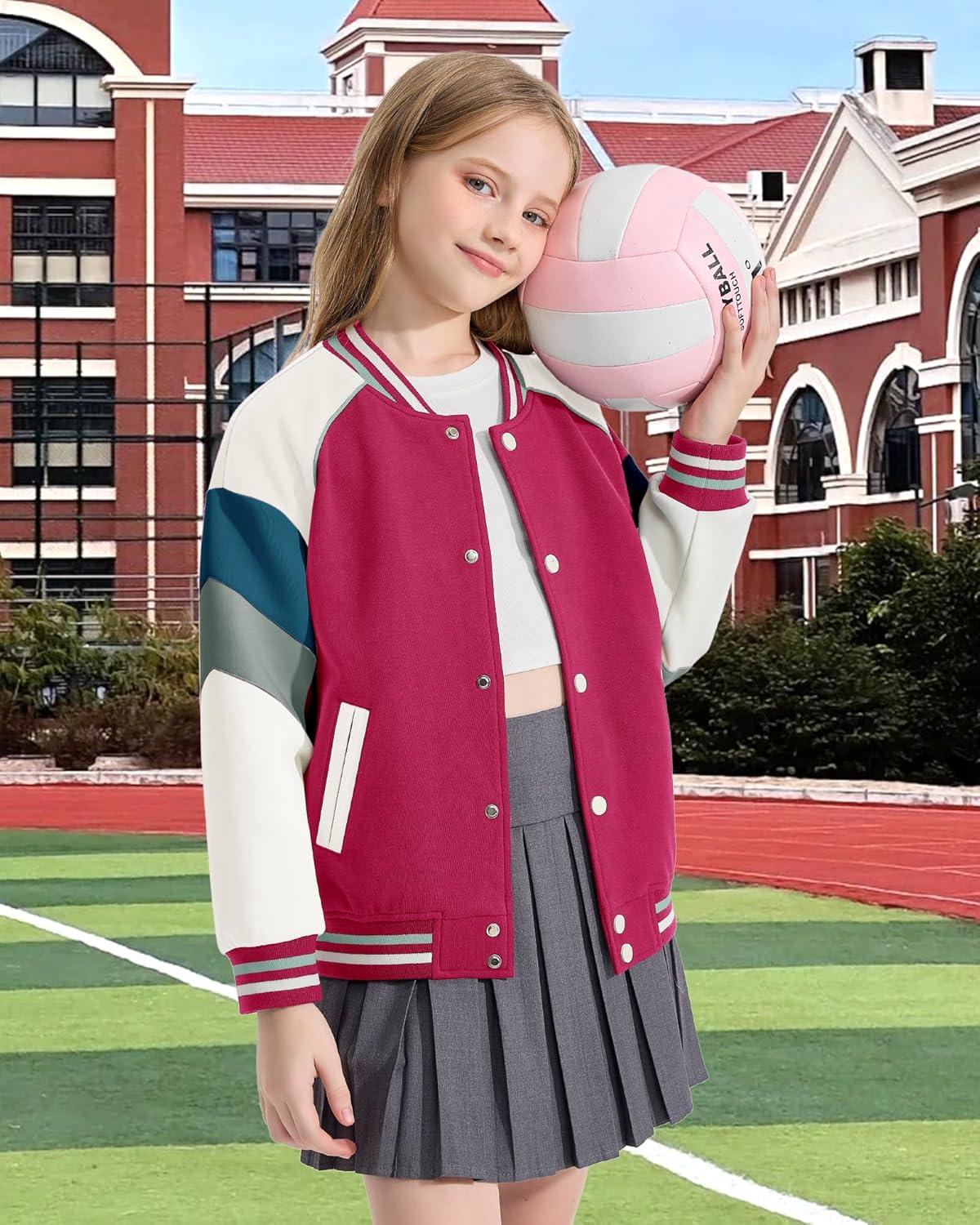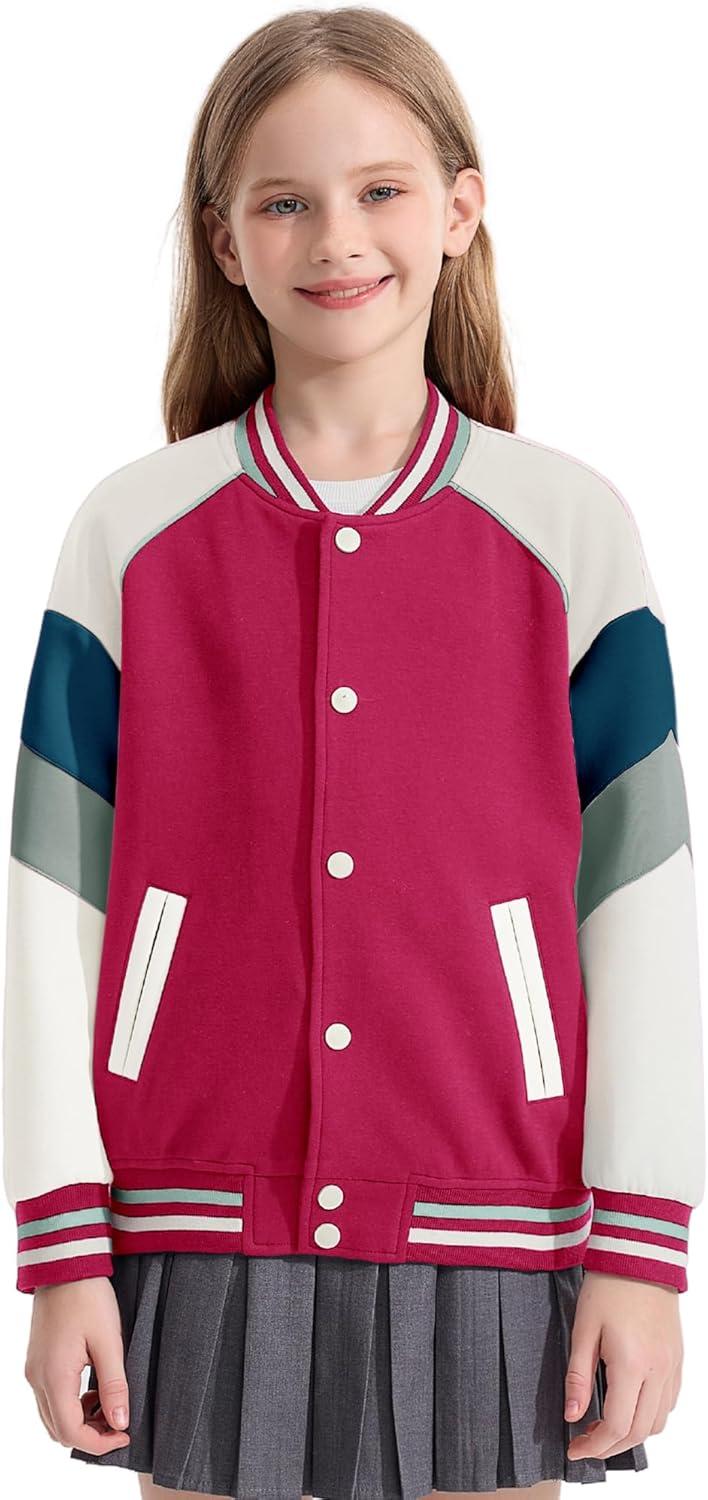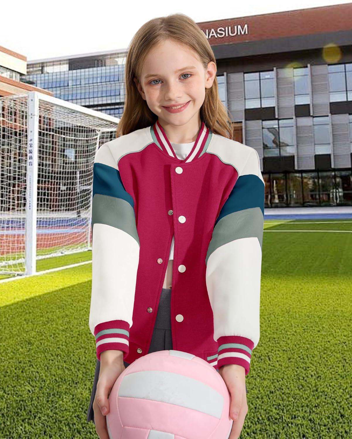 Rolanko Girls Varsity Jackets Baseball Bomber Color Block Letterman Jacket Outwear With Pockets 7-15 Years(Rose)